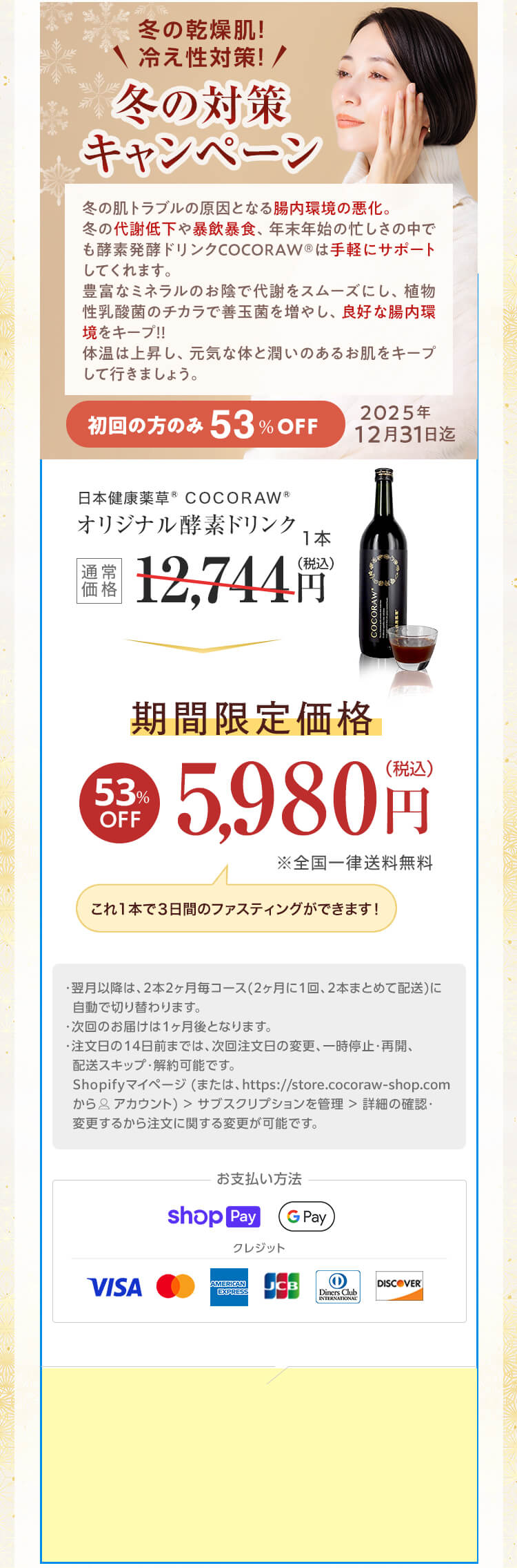 定期便だとお得です 日本健康薬草 COCORAW®オリジナル酵素ドリンク720ml1本 12,744円(税込)定期便だと、1本あたり19,116円(税込)が、9,558円(税込)に!定価の25%、毎回6,372円お得です。国内送料無料 休止変更はいつでも可能です。継続のお知らせ通知は、2ヶ月毎にお知らせをお送りさせて頂きます。休止・変更の際はお問い合わせよりご連絡ください。